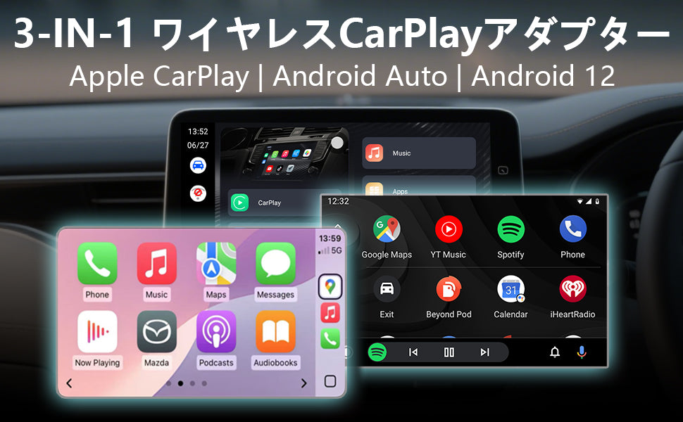 • 🚗 [今日CarPlayをワイヤレスCarPlay/Android Autoにアップグレード] 一日CarPlayは操作が面倒です。AI Boxは、工場出荷時に搭載されているいつもApple CarPlayをフルの機能でワイヤレスCarPlay /Android Autoにアップグレードします。AndroidユーザーでもワイヤレスAndroid Autoを利用できるように簡単になります。