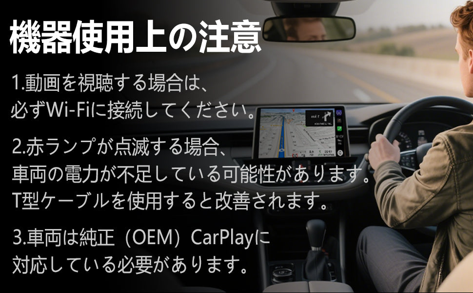 • 1. ご購入前に、お車が以下の要件を満たしていることをご確認ください。 テスラまたはBMWではないこと。 マーケットのCarPlayシステムを搭載していないこと。 タッチスクリーンを搭載していること。 現在CarPlayに対応していること(センターコンソールにCarPlayアイコンが表示されている事を確認してください。純正データケーブルを使用してiPhoneを車両のUSBポートに接続してください。「CarPlayを使用しますか?」というメッセージが表示されたら、CarPlayに対応しています)。